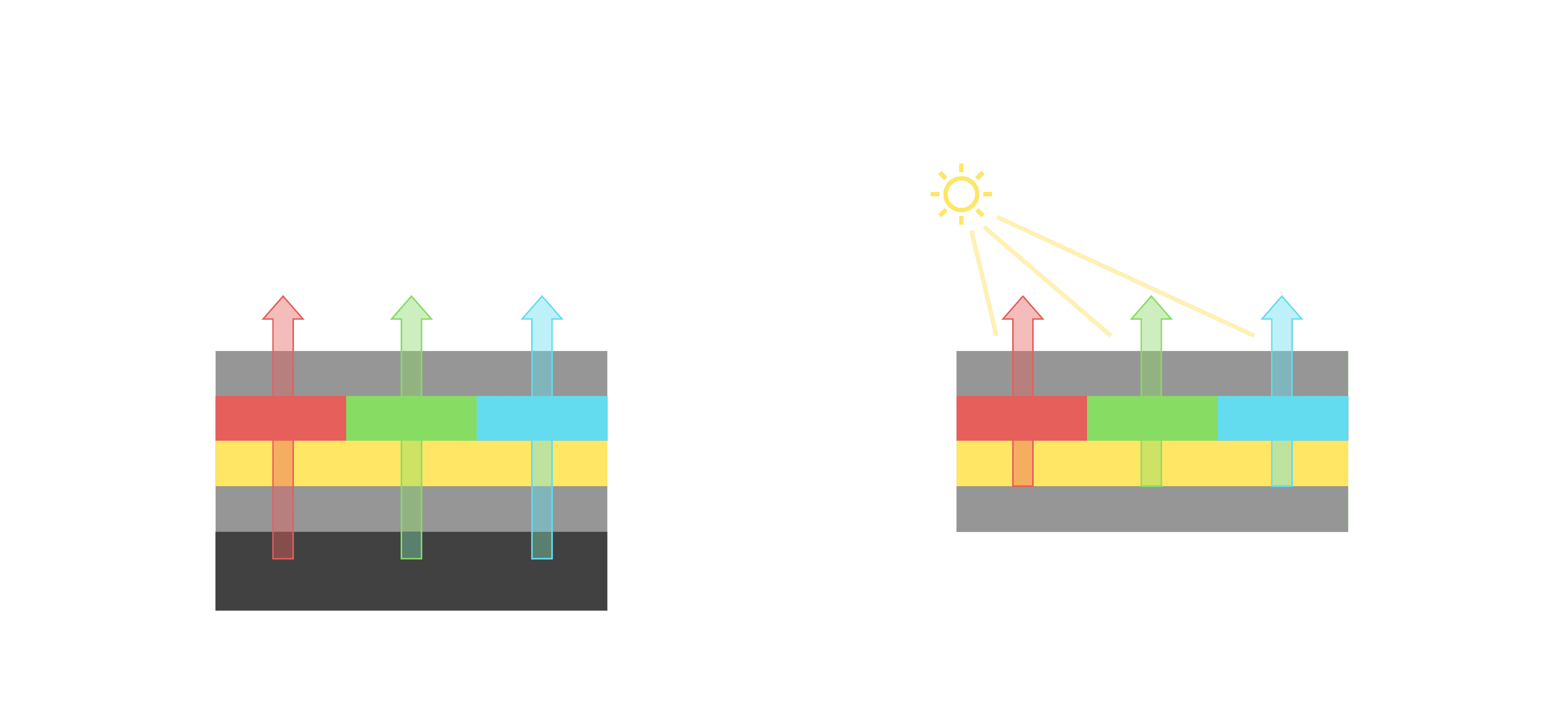 与传统需搭配背光单元的液晶显示相比,,,,反射式液晶技术不仅更省电、、、更轻薄,,,且即便在艳阳下仍能清晰显示。。此外,,少了背光单元,,,也大幅降低了 LED 蓝光伤害眼睛的疑虑。。