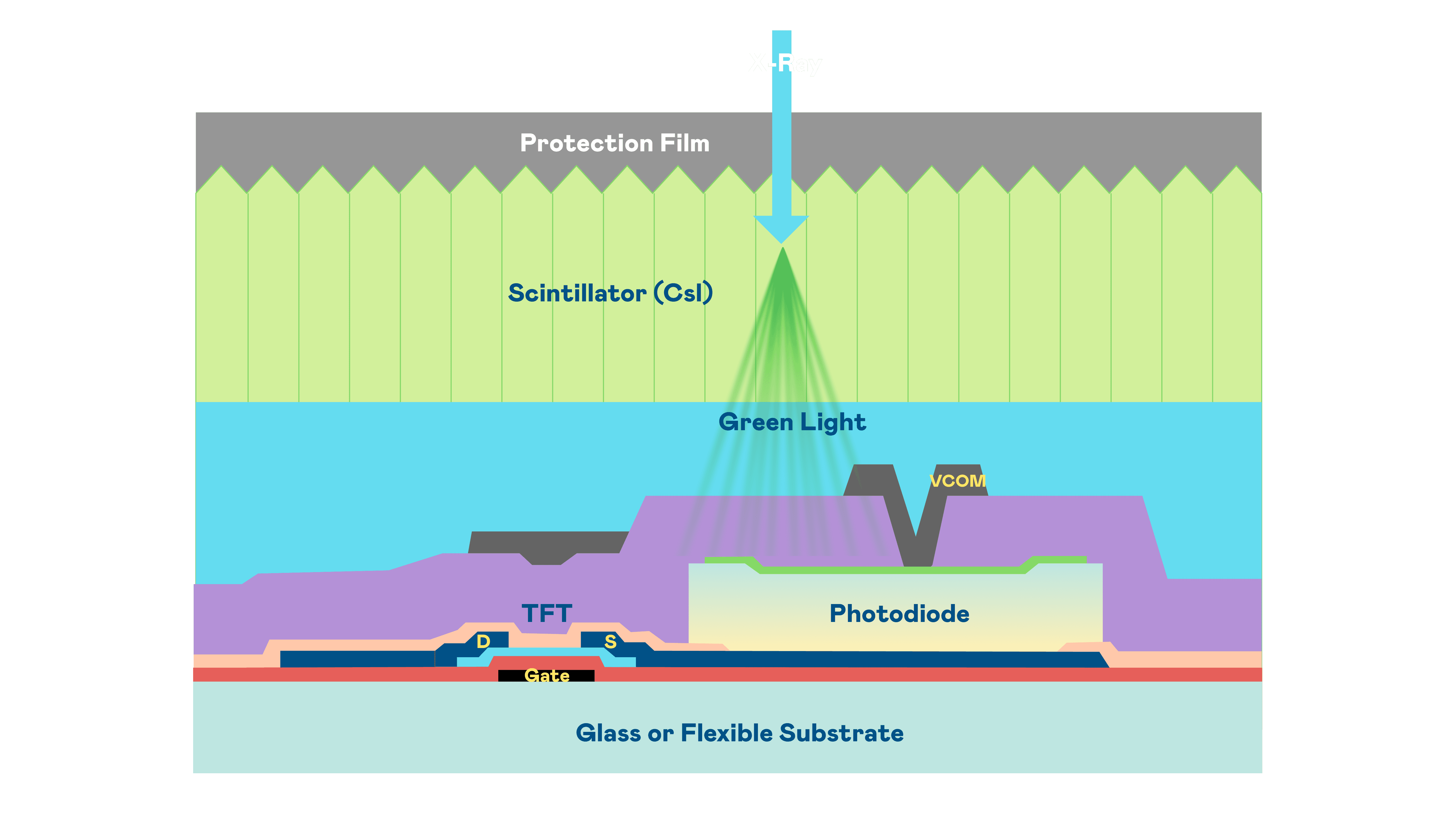 口袋牛店的X光影像感测阵列使用薄膜电晶体 (TFT) 作为每个像素的读取开关,,,,搭配光电二极体(Photodiode)的光电转换元件,,,用以感测X光影像讯号。。。。
