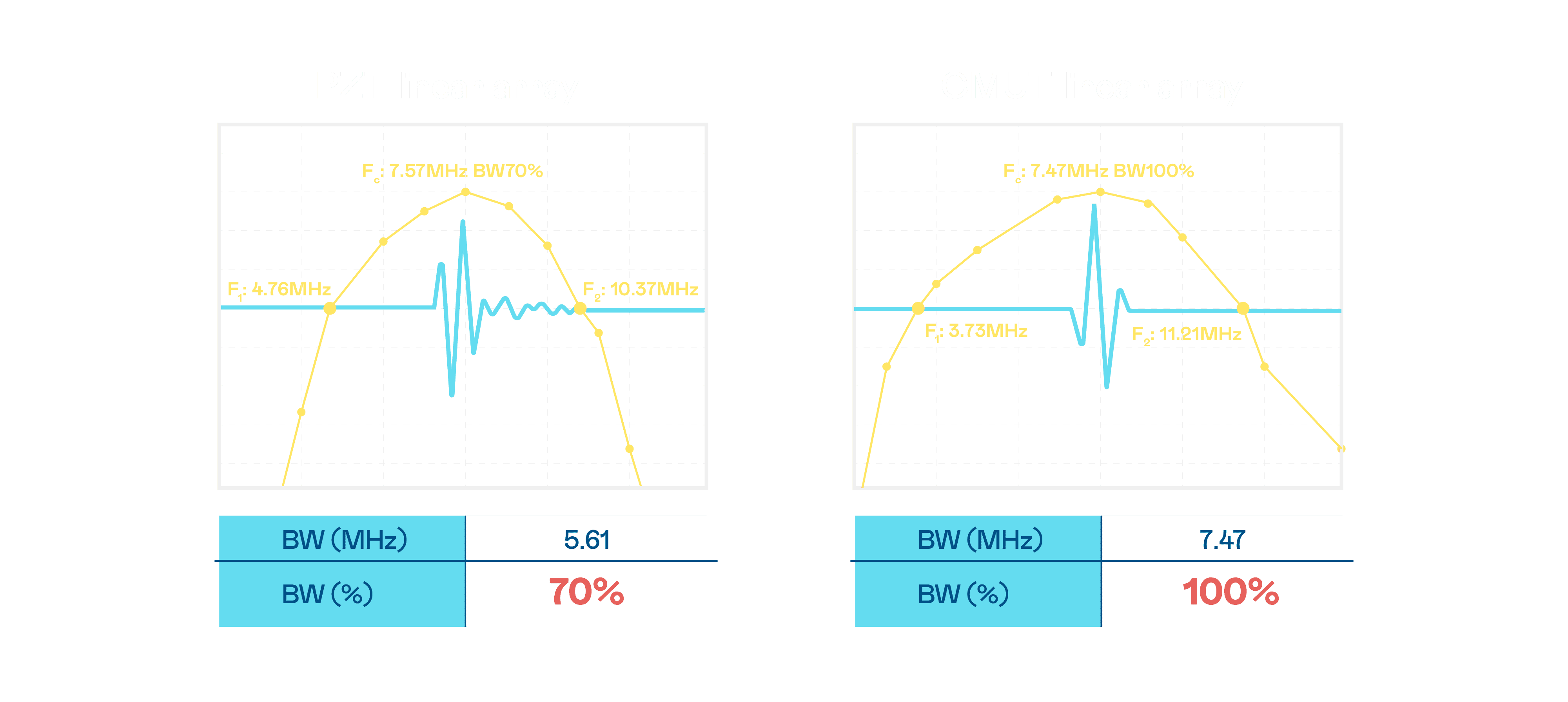 超音波影像的解析度高低,,首先取决于探头能发出的讯号频宽。。。。口袋牛店 CMUT 可提供高清晰的超音波讯号,,,,提供高频宽、、、高灵敏度、、、影像纹理细节更高的超音波影像,,协助医护人员缩短影像判读时间及利用精准的医疗影像进行诊断。。